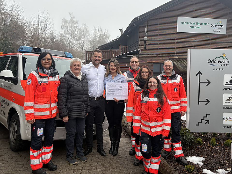 In der Nacht des 05. Januar 2026 wurden Katharina und Gregor Bialecki, Inhaber des Odenwald Camping in Krumbach, durch ihre Hundedame „Bella“ aus dem Schlaf gebellt und auf einen gestürzten und verletzten Senior an deren Grundstück aufmerksam gemacht. Die Helfer-vor-Ort des DRK Limbach waren bereits wenigen Minuten nach dem Notruf zur Stelle, um Erste Hilfe zu leisten (RNZ berichtete am 17.01.26). Familie Bialecki zeigte sich erneut tief beeindruckt und dankbar über die Schnelligkeit und Professionalität der Ehrenamtlichen, die sie auch regelmäßig bei Einsätzen auf dem Campingplatz im Krumbach miterleben können. So begründete sich eine Spendenaktion, bei der es sich einige der Dauercamper nicht nehmen ließen, ihre Dankbarkeit zum Ausdruck zu bringen. Familie Bialecki stockte den Betrag noch auf und die Limbacher Rotkreuzlerinnen und Rotkreuzler staunten letztlich nicht schlecht, als eine Spende von insgesamt 1.200 € für den Ortsverein übergeben werden konnte. Eine enorme Summe und großartige Unterstützung für die gemeinnützige Arbeit des Limbacher DRK. Wir bedanken uns an dieser Stelle herzlich bei Dauercamperin Elisabeth stellvertretend für alle Beteiligten des Campingplatzes und natürlich Familie Bialecki für diese tolle Wertschätzung unserer Arbeit.